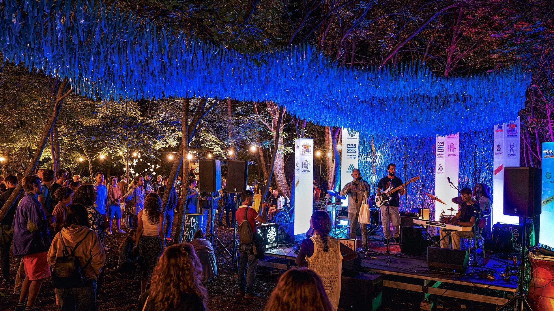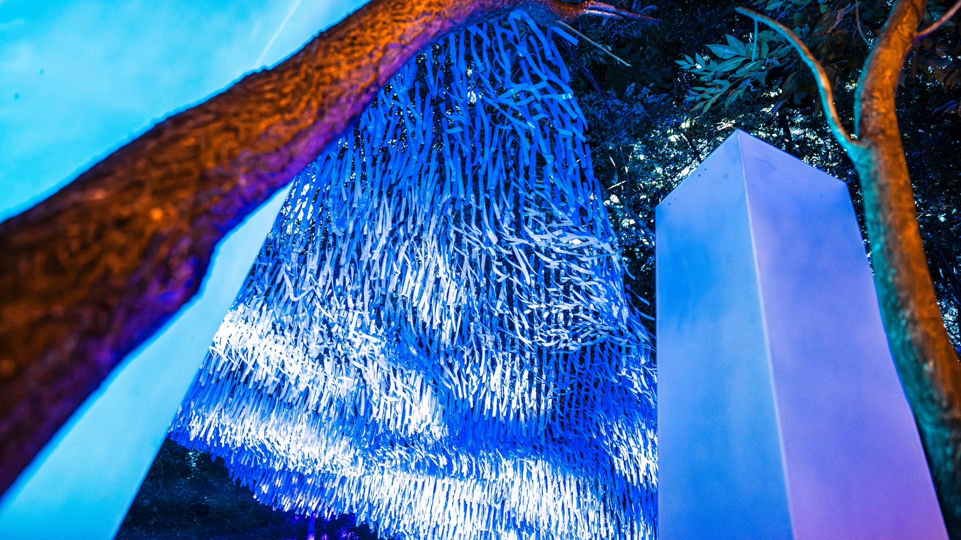 The serpent’s body is formed from 30,000 suspended strips of recycled plastic, becoming its luminous scales. Designed and assembled collectively, the structure was brought to life through community workshops where volunteers and collaborators helped cut, connect, and suspend each element — every scale representing a single droplet within the greater stream.