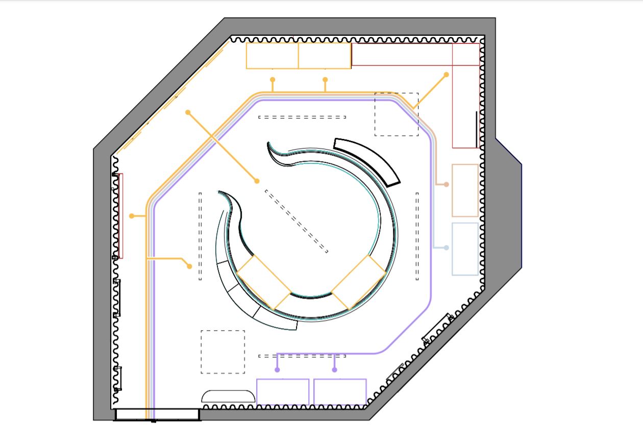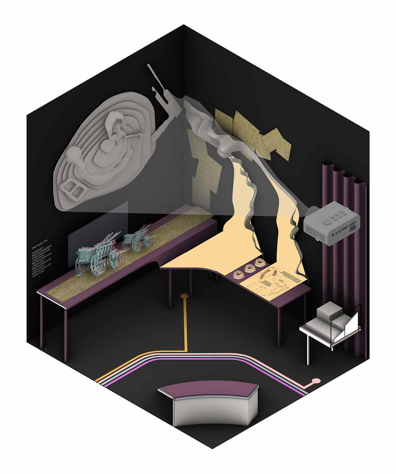The project places the findings from the mound at its center, enclosed by a semi-transparent screen that maintains a visual connection to the objects from anywhere in the hall.